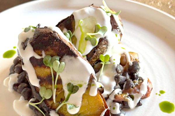 Patata americana, arrostita alla brace, profumata alle erbe su zuppetta di legumi e cremoso al pecorino romano